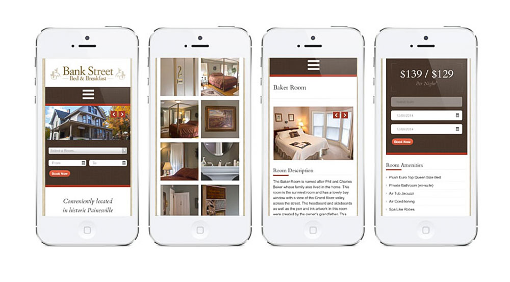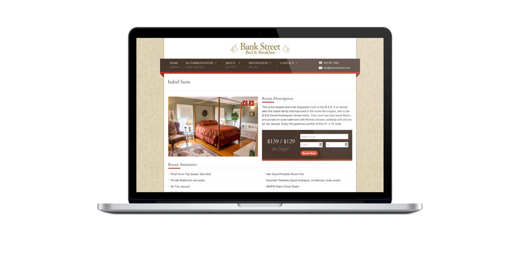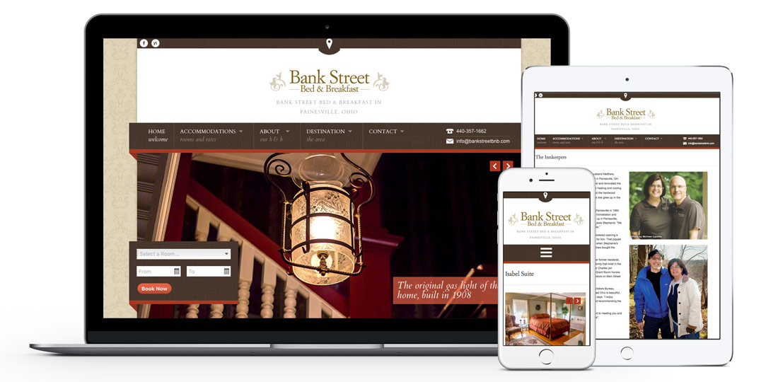 A complete website design with photography session for a local boutique bed and breakfast in Painesville, Ohio. The use of enhanced photography instantly transforms this century home into an enchanted overnight stay. The website design was completely rethought to include online booking, room photo galleries, house history, and local activities, while incorporating a mobile site design.