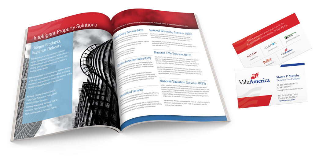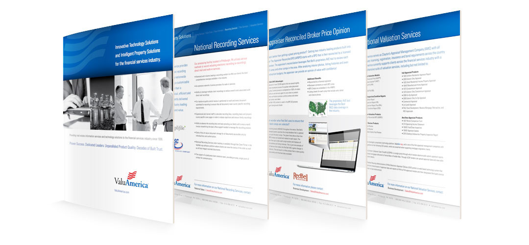 Design projects for ValuAmerica, Inc. This well established company needed a boost their dated website and marketing materials. These new products now reflect the high level of service that ValuAmerica provides to its customers in the financial and title industry.